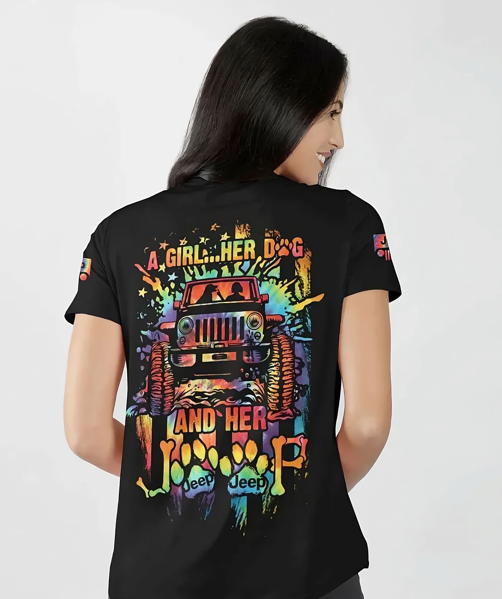 A Girl Her Dog And Her Jeep All Over Print 1 Women V-Neck T Shirt