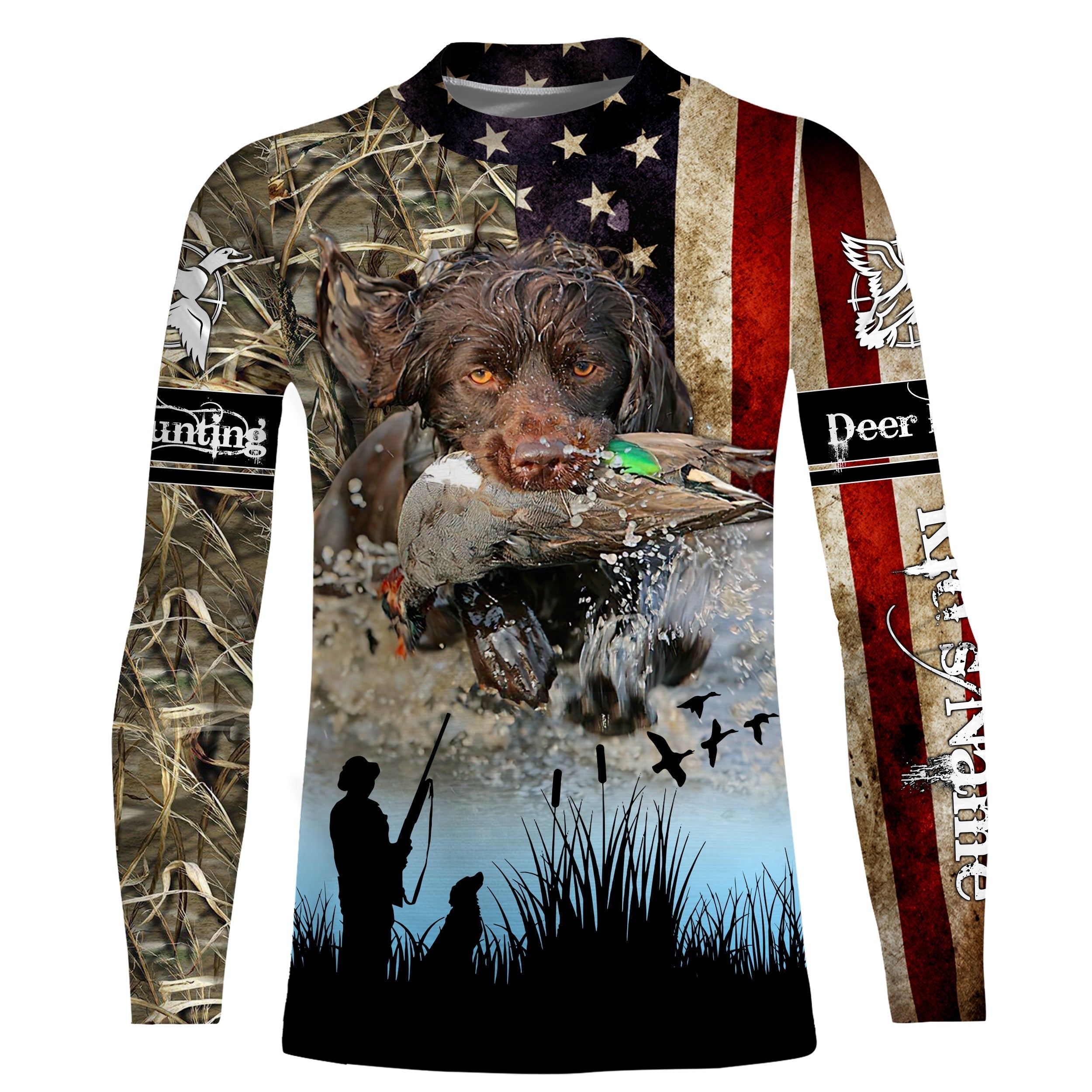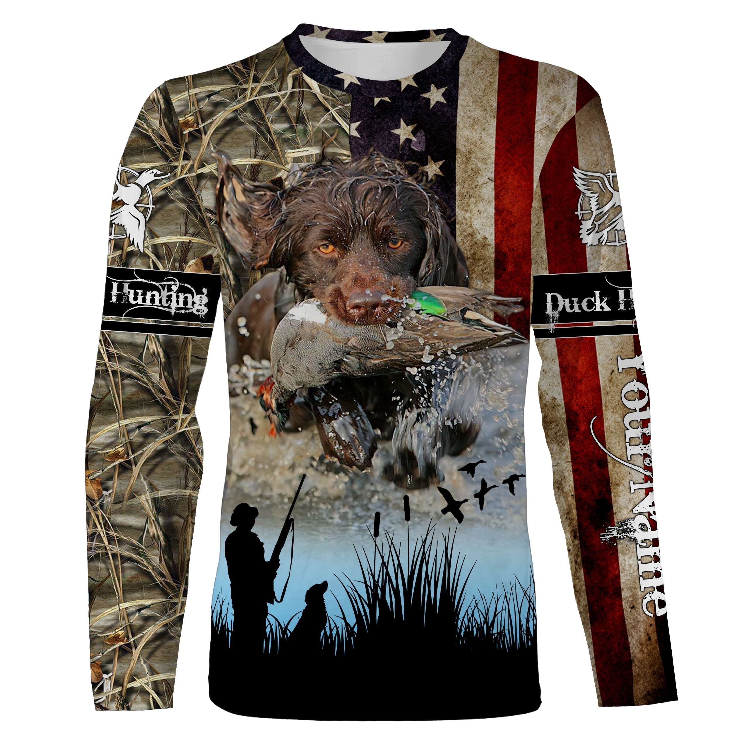 American Flag Boykin Spaniel Duck Hunting Dog Waterfowl Camo Custom Name 3D Hunting Apparel, Fishing Long Sleeve Shirts