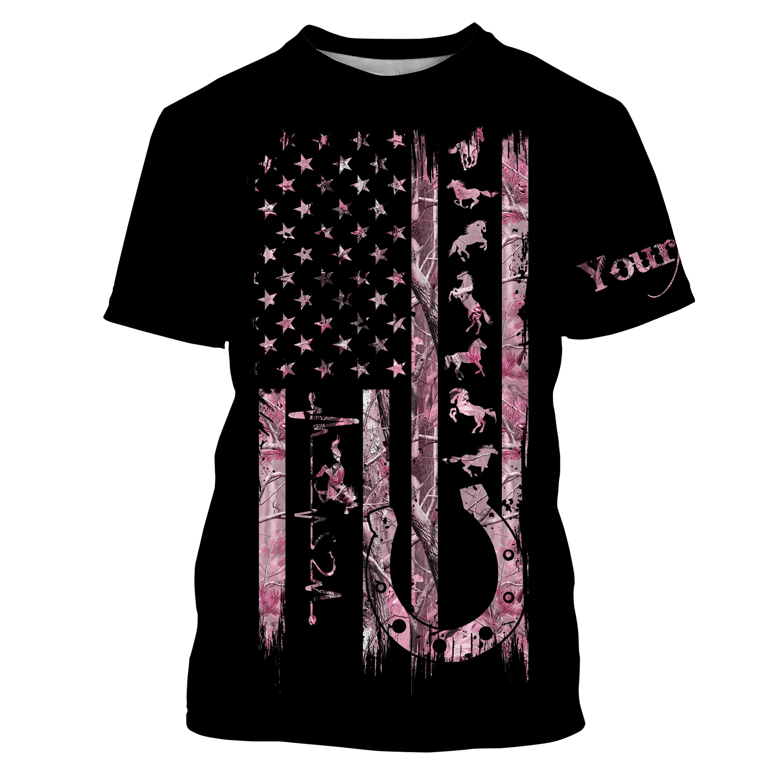 American Flag Patriotic Horse Tattoo Pink Camo Custom Name Equestrian Horse Riding Shirts, Fishing T Shirt