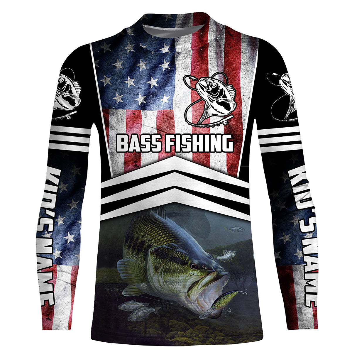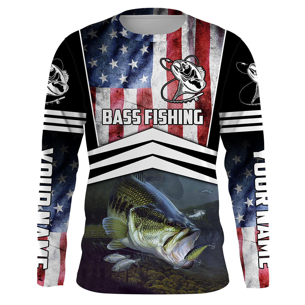 American Flag Patriotic Largemouth Bass Fishing, Long Sleeve Fishing Shirts Sun Protection Shirts Quick Dry Customize Name UPF 30+ Fishing Apparel, Fishing Long Sleeve Shirts