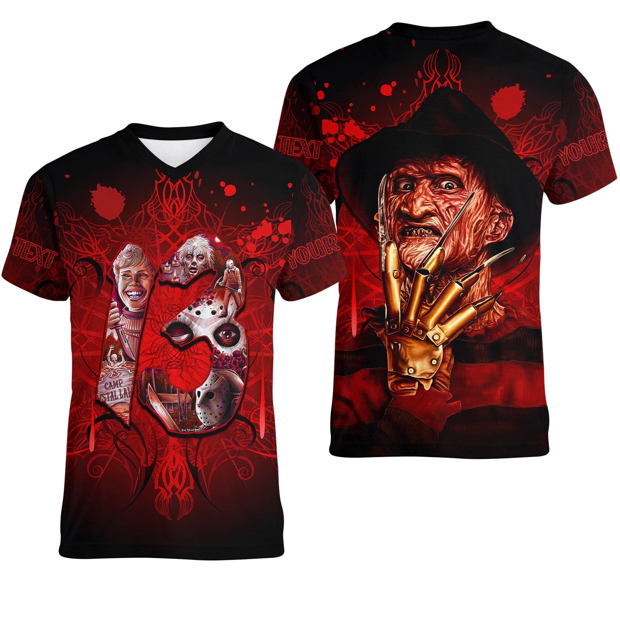 (Custom Personalised) Happy Halloween V-Neck T Shirt Scare Friday the 13th Freddy Back LT13