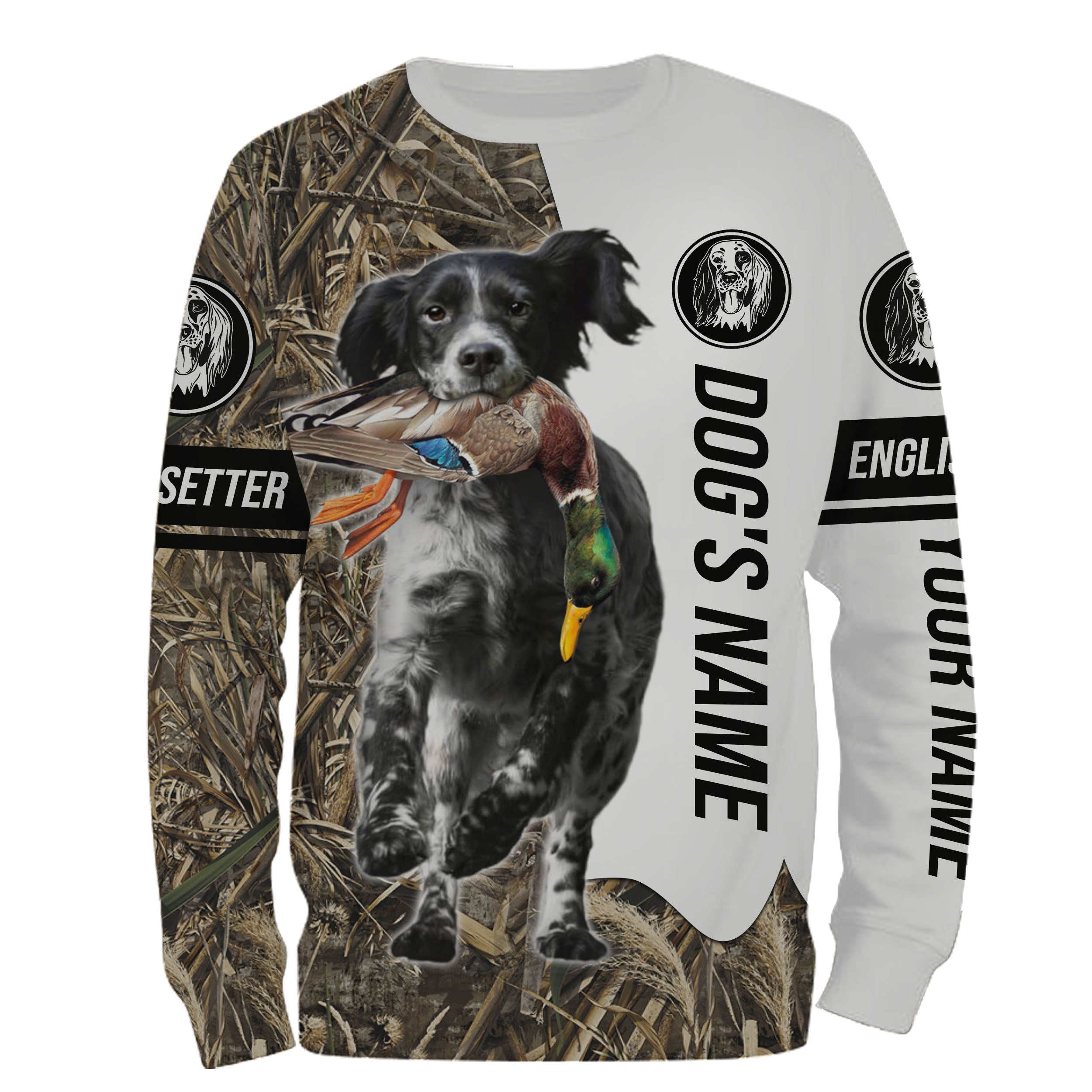 Duck Hunting With Llewellin English Setter Dog (Blue Belton) Custom Name Camo Full Printing Shirts, Personalized Hunting Gift, Fishing Sweatshirt